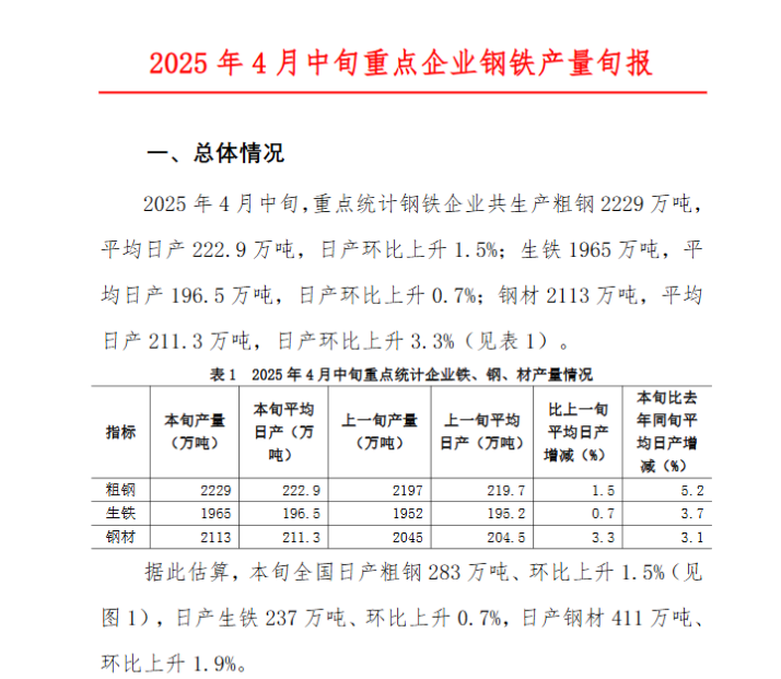 据中国钢铁工业协会统计数据显示,2025年4月中旬重点钢企生铁日均产量196.5万吨,旬环比上升0.7%,同比上升3.7%;粗钢日均产量222.9万吨,旬环比上升1.5%,同比上升5.2%;钢材日均产量211.3万吨,旬环比上升3.3%,同比上升3.1%。