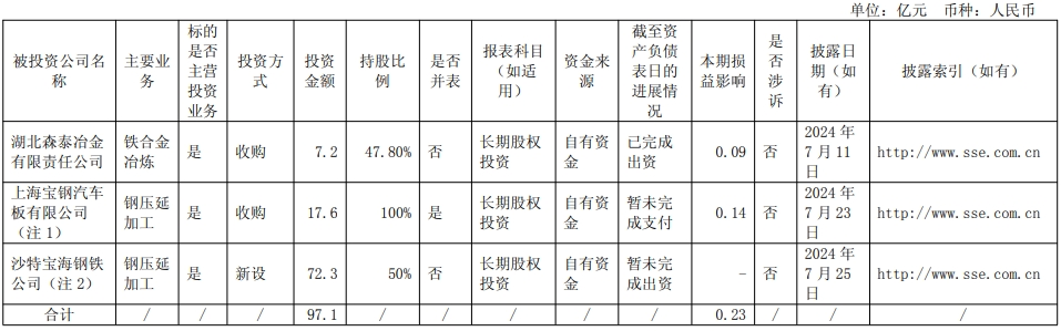 2024 年宝钢日铁汽车板有限公司合营期限届满,公司收购日方股东日本制铁所持全部股权,收购完成后,其成为公司下属全资子公司,并更名为上海宝钢汽车板有限公司。截至2024 年年末,公司拥有其 100%股权,该公司注册资本人民币 30 亿元,主要经营范围为生产、销售用于汽车、汽车零部件的冷轧钢板和热镀锌钢板,并从事与上述业务相关的附带业务,共632 名员工。截至2024年年末,该公司总资产为 64.0 亿元,净资产为 39.0 亿元,全年实现净利润1.5 亿元。