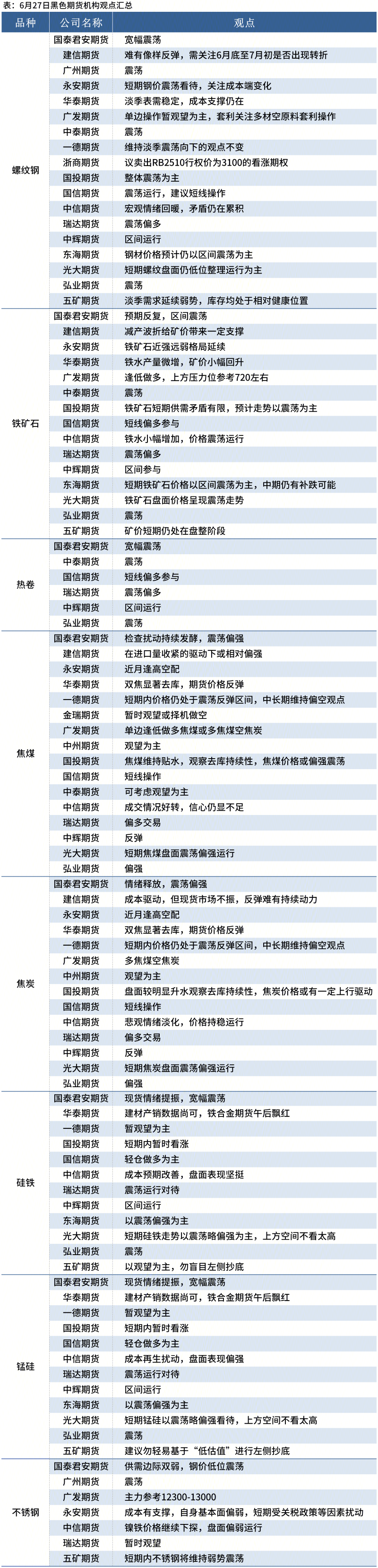据Mysteel统计6月27日20家期货机构操作策略,其中多数机构料螺纹钢震荡运行,铁矿石震荡运行。具体汇总内容如下: