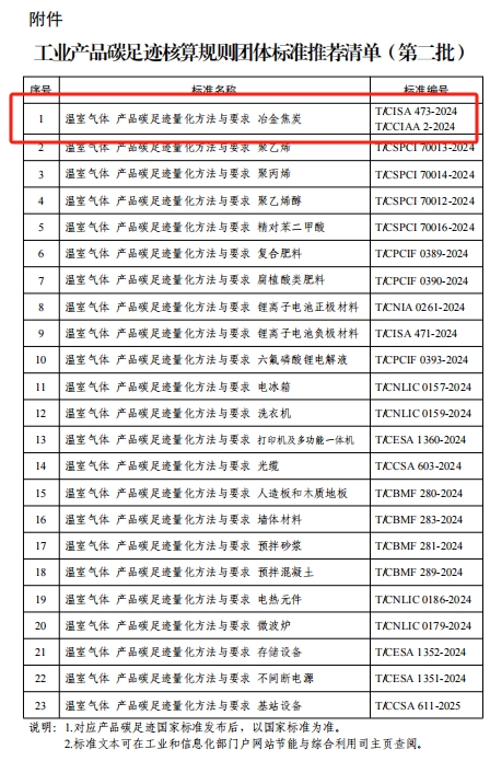 为加快提升工业产品碳足迹管理水平,建立健全碳足迹管理体系,促进工业绿色低碳转型,经相关标准化机构推荐、专家评审、网上公示等程序,工业和信息化部、生态环境部、国家发展改革委、市场监管总局确定了23项工业产品碳足迹核算规则团体标准推荐清单(第二批),现予以公布。