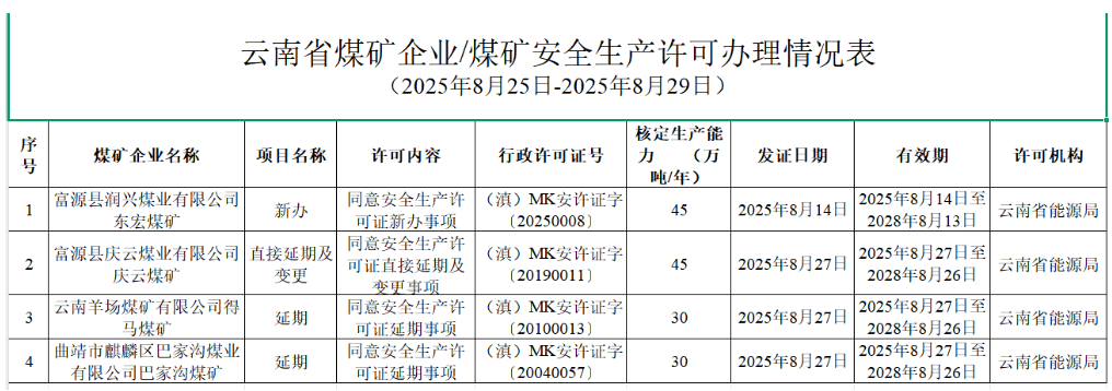 云南省煤矿安全生产许可情况表(2025年8月25日-2025年8月29日)