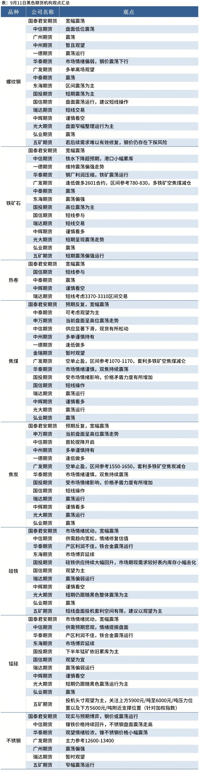 据Mysteel统计9月11日17家期货机构操作策略,其中多数机构料螺纹钢震荡运行,铁矿石震荡运行。具体汇总内容如下: