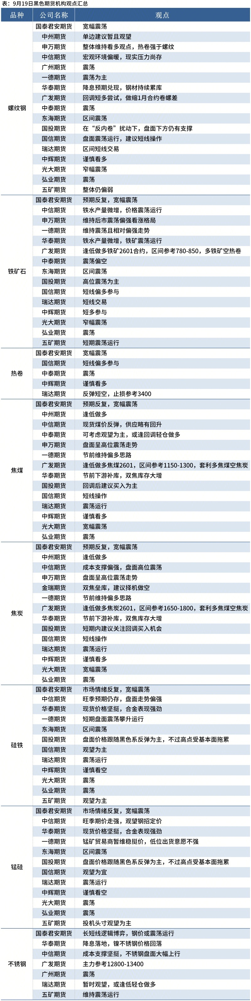 据Mysteel统计9月19日18家期货机构操作策略,其中多数机构料螺纹钢震荡运行,铁矿石震荡运行。具体汇总内容如下: