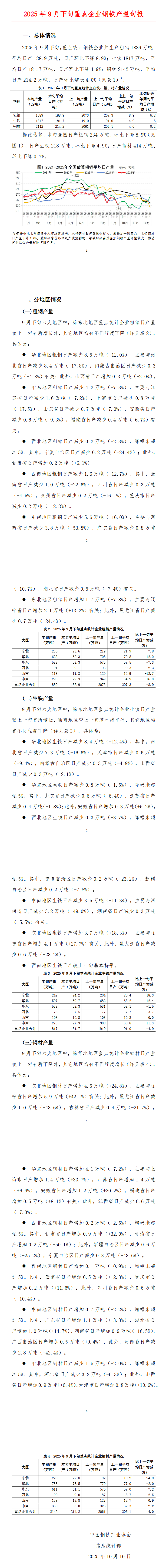 2025年9月下旬,重点统计钢铁企业共生产粗钢1889万吨,平均日产188.9万吨,日产环比下降8.9%;生铁1817万吨,平均日产181.7万吨,日产环比下降4.9%;钢材2142万吨,平均日产214.2万吨,日产环比增长4.0%。