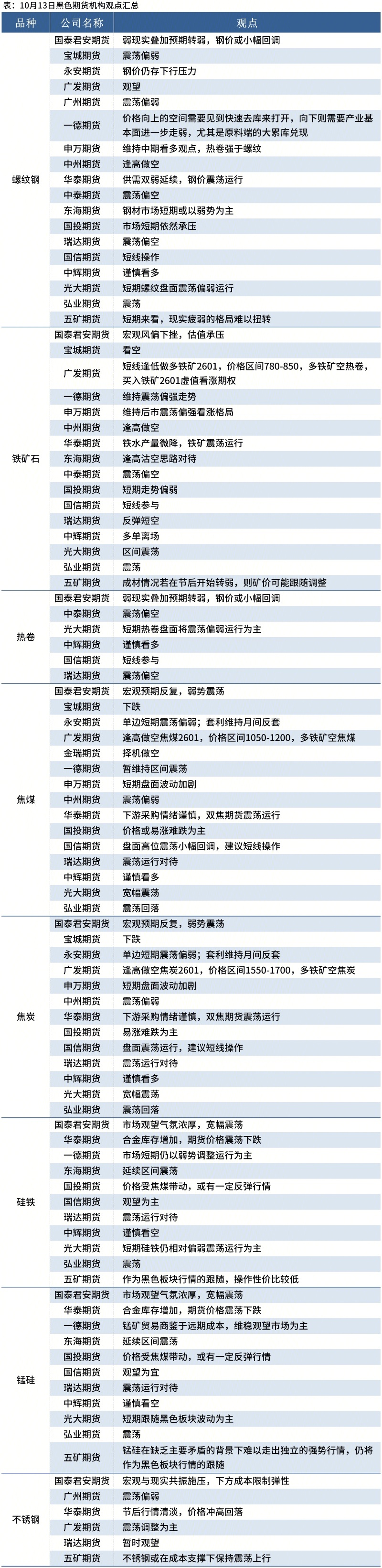 Mysteel统计10月13日18家期货机构操作策略,其中多数机构料螺纹钢震荡偏弱,铁矿石震荡运行。具体汇总内容如下: