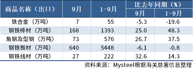 9月,中国出口钢铁棒材168万吨,同比增长25.0%;1-9月累计出口1393万吨,同比增长48.3%。其他出口情况如下表所示: