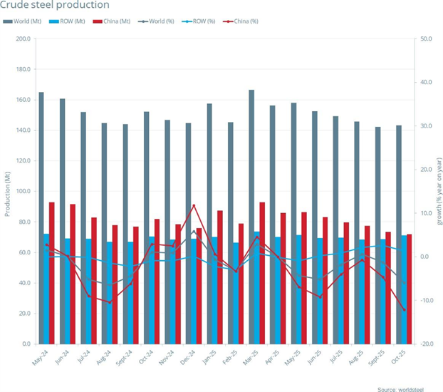 2025年10月全球70个纳入世界钢铁协会统计国家/地区的粗钢产量为1.433亿吨,同比下降5.9%。