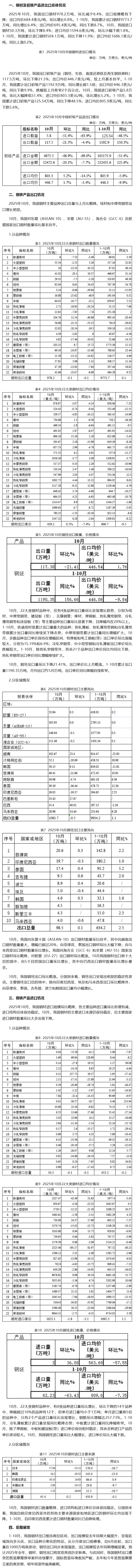 2025年10月,我国出口钢材978.2万吨,环比减少8.4%,出口规模略有下降;出口均价684.4美元/吨,环比增长0.8%。1-10月,我国累计出口钢材9773.7万吨,同比增长6.4%;出口均价695.4美元/吨,同比下跌8.7%。10月,我国进口钢材50.3万吨,环比下降8.4%;进口均价1594.6美元/吨,环比小幅下跌1.8%。1-10月,我国累计进口钢材504.1万吨,同比下降11.9%;进口均价1686.1美元/吨,同比上涨0.2%。