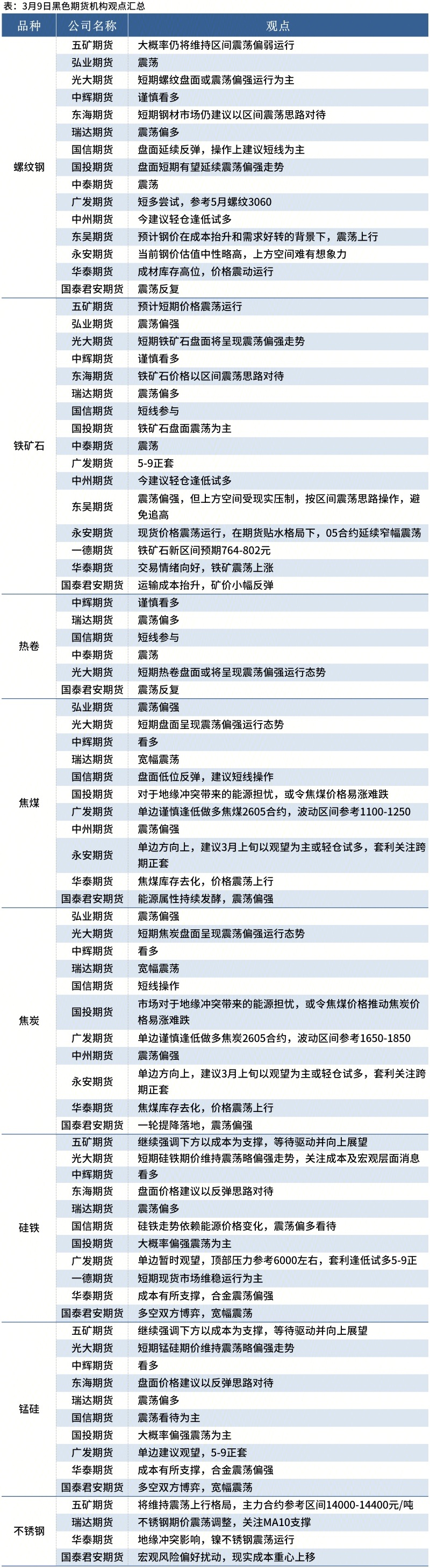 据Mysteel统计3月9日16家期货机构操作策略,其中多数机构料螺纹钢震荡运行,铁矿石震荡偏强,焦煤、焦炭震荡偏强。具体汇总内容如下: