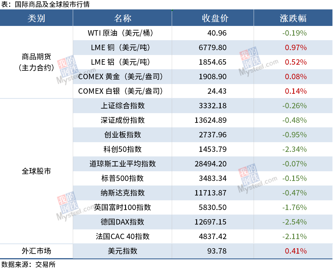 ◎世界钢铁协会预期2020年全球钢铁需求将下降2.4%至17.25亿吨,此前预期为下降6.4%,预期2021年全球钢铁需求将增长4.1%至17.95亿吨。