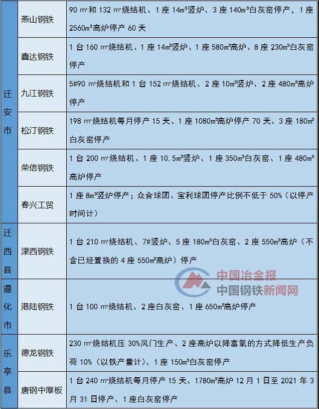 11月3日,唐山市人民政府办公室印发《唐山市2020-2021年度秋冬季空气质量强化保障方案》(以下简称《方案》)。按照该《方案》,2020年11月1日0时至2021年3月31日24时,除了绩效评级为A级的首钢迁钢、首钢京唐公司采取自主减排外,其他唐山钢企均要不同程度实施停限产。