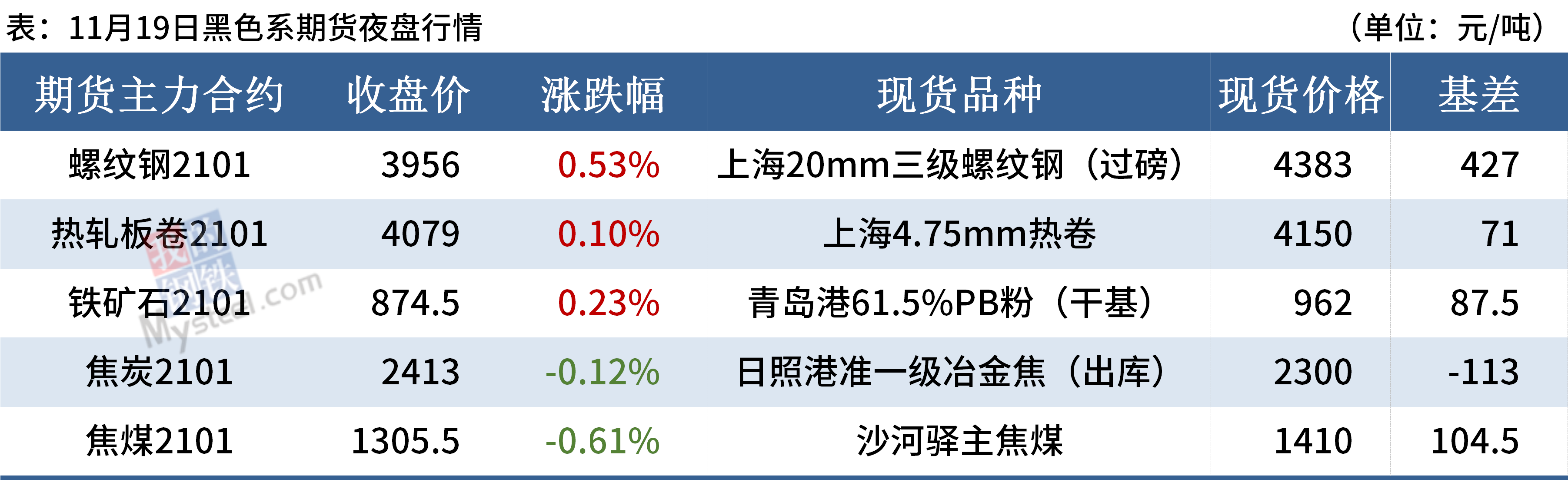 ◎ 19日Mysteel铁矿石港口现货价格62%澳粉指数901,涨12,58%澳粉指数838涨5,65%巴西粉指数1003涨9。(单位:元/湿吨)MRI:近期矿石期货缘何大幅上涨>>