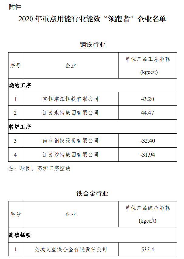 按照《工业和信息化部办公厅 市场监管总局办公厅关于组织开展2020年度重点用能行业能效“领跑者”遴选工作的通知》(工信厅联节函〔2020〕234号)要求,工业和信息化部、市场监管总局组织开展了钢铁、铁合金、电解铝、铜冶炼、铅冶炼、水泥、平板玻璃、原油加工、乙烯、合成氨、甲醇、烧碱、电石、焦化行业能效“领跑者”遴选工作,遴选出65家达到行业能效领先水平的“领跑者”企业,现予公告。