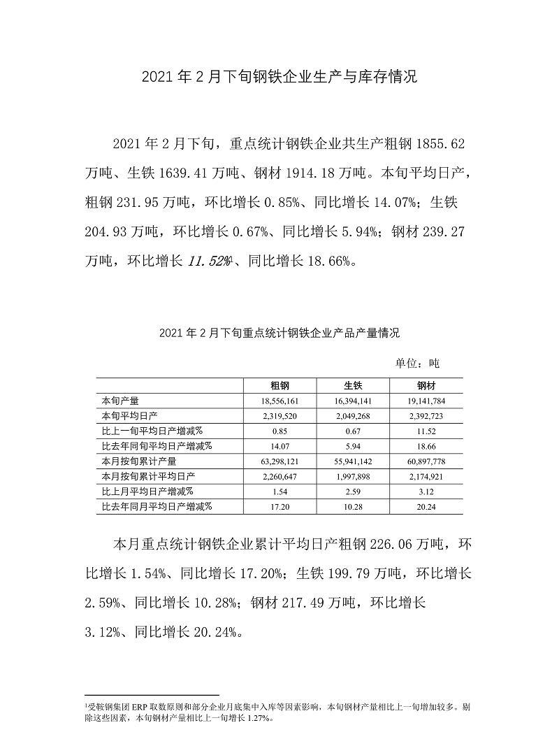 中钢协数据显示,2021年2月下旬,重点统计钢铁企业共生产粗钢1855.62万吨,生铁1639.41万吨,钢材1914.18万吨。