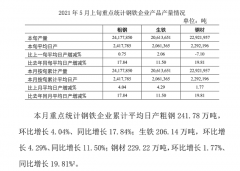 2021年5月上旬,重点统计钢铁企业粗钢日均产量241.78万吨,环比增长0.75%,同比增长17.84%;钢材库存量1468.38万吨,比上一旬增加127.0万吨,增长9.47%。