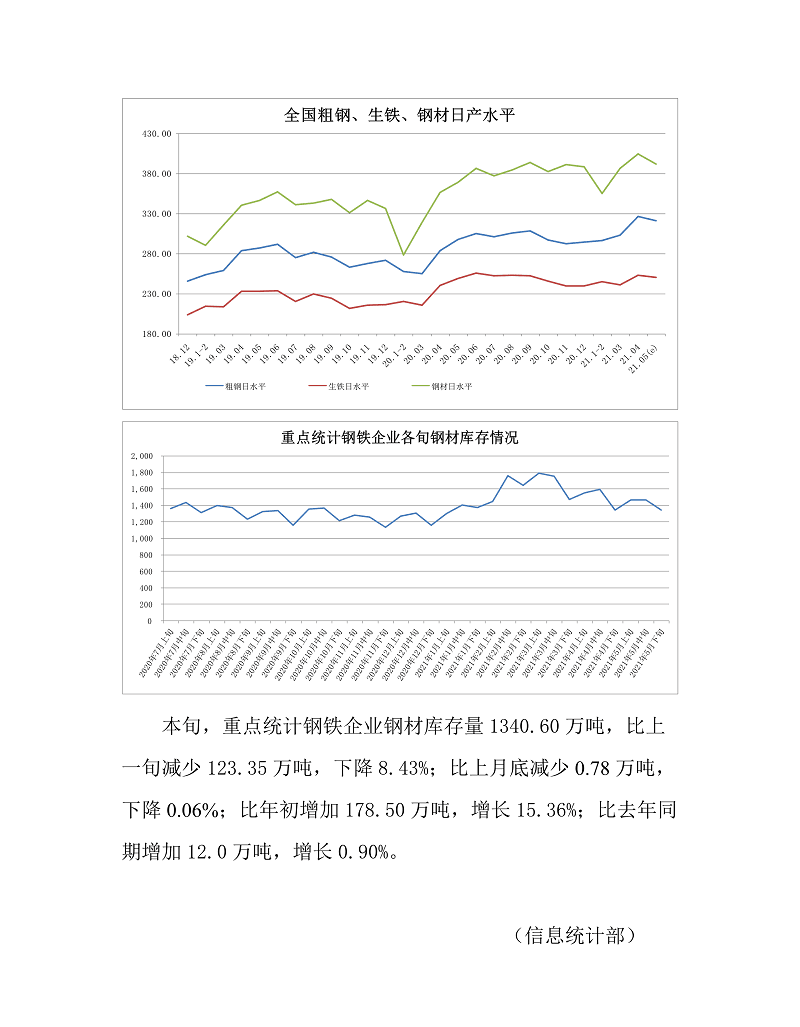 新干线讯 据中钢协最新数据显示,2021年5月下旬重点统计钢铁企业粗钢日均产量228.61万吨,环比下降3.92%、同比增长9.25%;截至5月下旬,钢材库存量1340.6万吨,比上一旬减少123.35万吨。