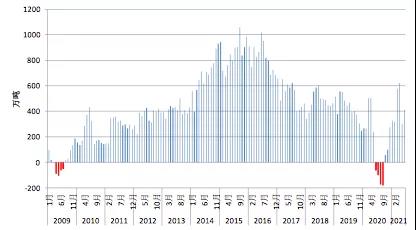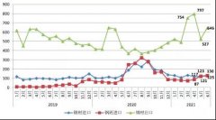 2.全年进口总量同比很难大幅增长。在钢铁行业利润处于近年来较高水平的情况下,2021上半年我国钢材进口量较2020上半年基本持平,较2020下半年大幅回落43%。2020年我国钢材进口量激增始于6月份,6-11月单月进口量达到223万吨,高基数效应下2021年我国钢材进口量同比很难大幅增长。从影响因素来看,去年导致中国钢材、钢坯进口量大幅增长的主要因素均已悄然发生改变:一是,中国钢铁需求保持强劲,但海外供应缺口更为严峻;二是,国际钢价随着需求的复苏涨幅明显超过国内,进口资源成本显著提升,去年阶段性进出口价格倒挂已不复存在,上述变化均不利于国内钢材进口保持高速增长。