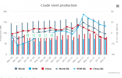 摘要:​世界钢铁协会:2021年8月全球粗钢产量同比减少1.4%,至1.568亿吨。中国8月的粗钢产量为8320万吨,同比下降了13.2%
