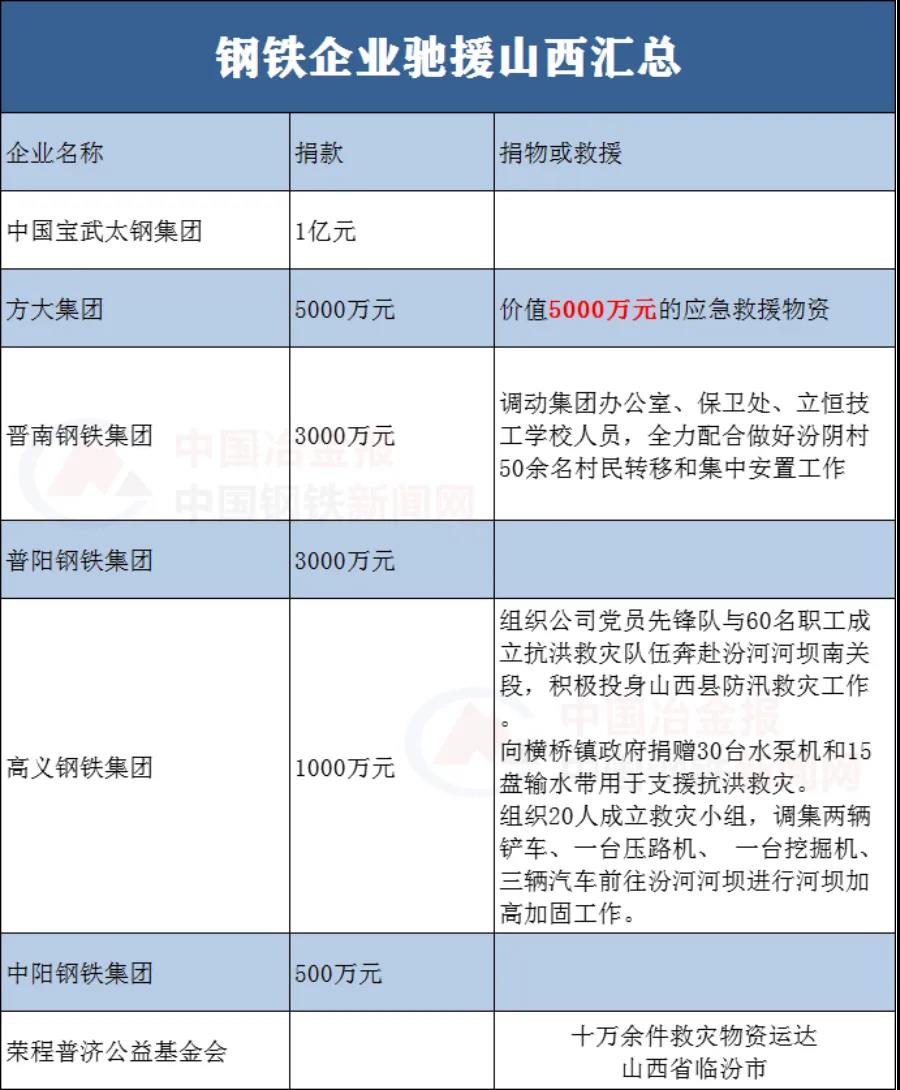 其中,多家钢铁企业已对此迅速展开驰援,据《中国冶金报》、中国钢铁新闻网小编不完全统计,钢企对山西汛情的捐款总金额已超过2亿元。
