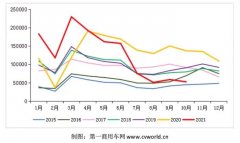 2015-2021年我国重卡市场销量月度走势图(单位:辆)