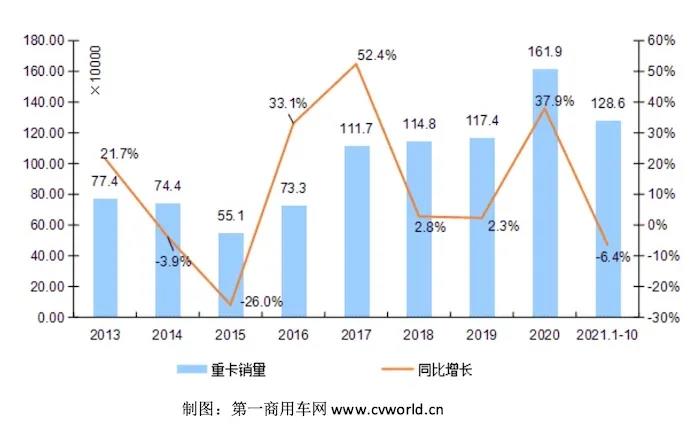 2013-2021年我国重卡市场销量年度走势图(单位:万辆)