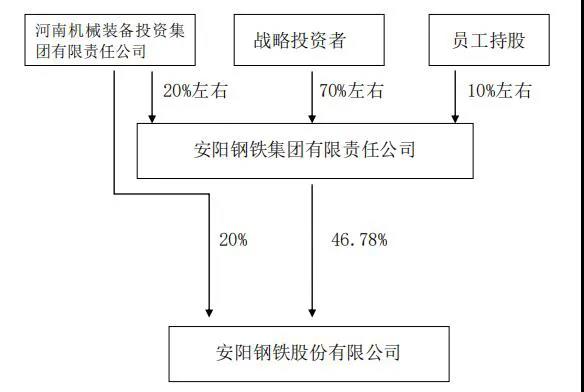 本次混改方案主要内容:先将安钢集团100%股权评估后作价出资至河南省人民政府国有资产监督管理委员会全资的河南机械装备投资集团有限责任公司(以下简称“河南装投集团”),以及将安阳钢铁20%股权无偿划转到河南装投集团;而后依托河南装投集团在产权交易所公开挂牌并采取综合评标方式确定一名战略投资者,转让安钢集团80%股权;战略投资者对安钢集团进行增资扩股,并实施员工持股等中长期激励。实施增资扩股及员工持股等中长期激励后,新安钢集团股权结构为战略投资者和安钢集团员工持股的比例合计80%左右(其中,安钢集团员工持股及股权激励的比例10%左右)、河南装投集团持股20%左右。
