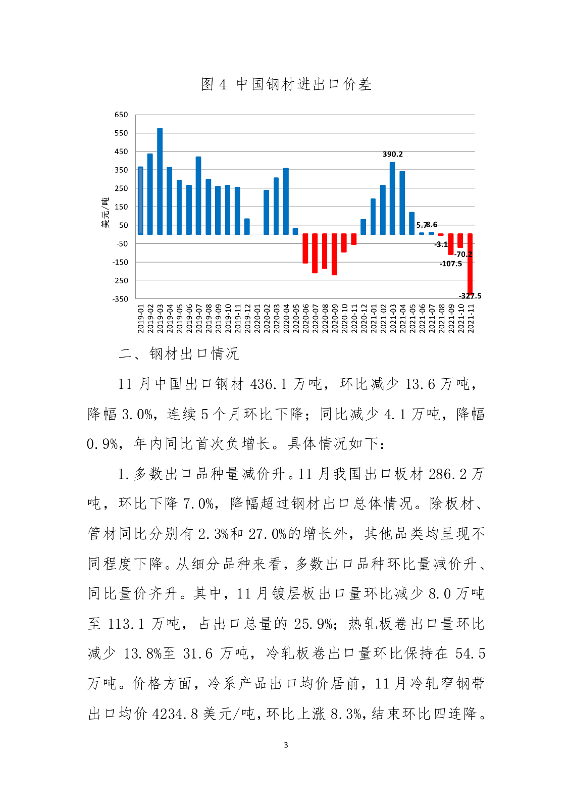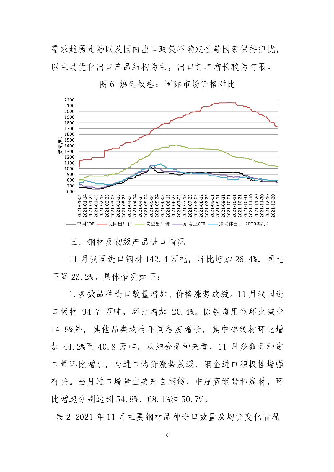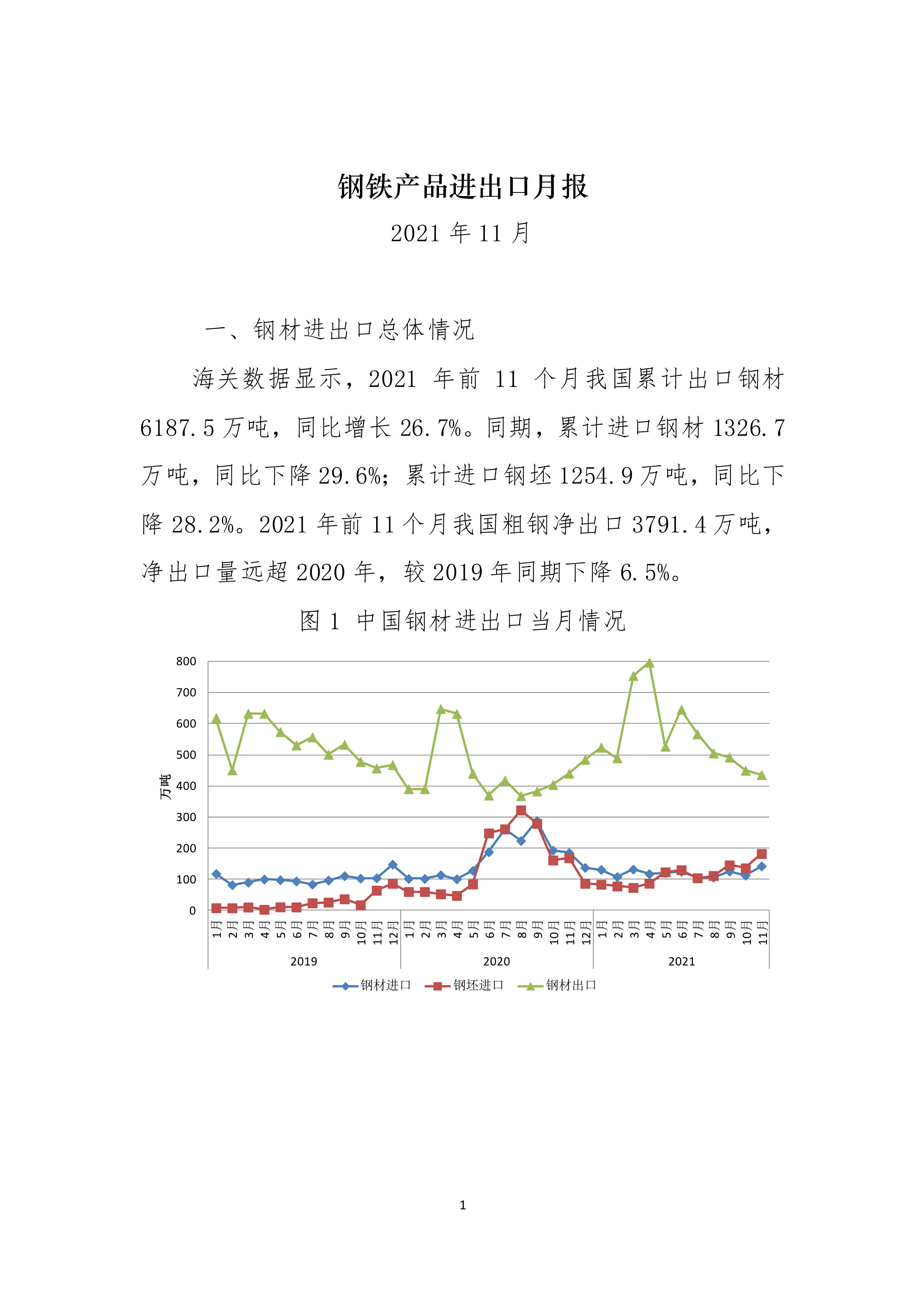 海关数据显示,2021年前11个月我国累计出口钢材6187.5万吨,同比增长26.7%。同期,累计进口钢材1326.7万吨,同比下降29.6%;累计进口钢坯1254.9万吨,同比下降28.2%。