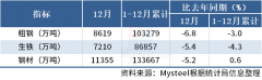 12月份,中国粗钢产量8619万吨,同比下降6.8%;生铁产量7210万吨,同比下降5.4%;钢材产量11355万吨,同比下降5.2%。