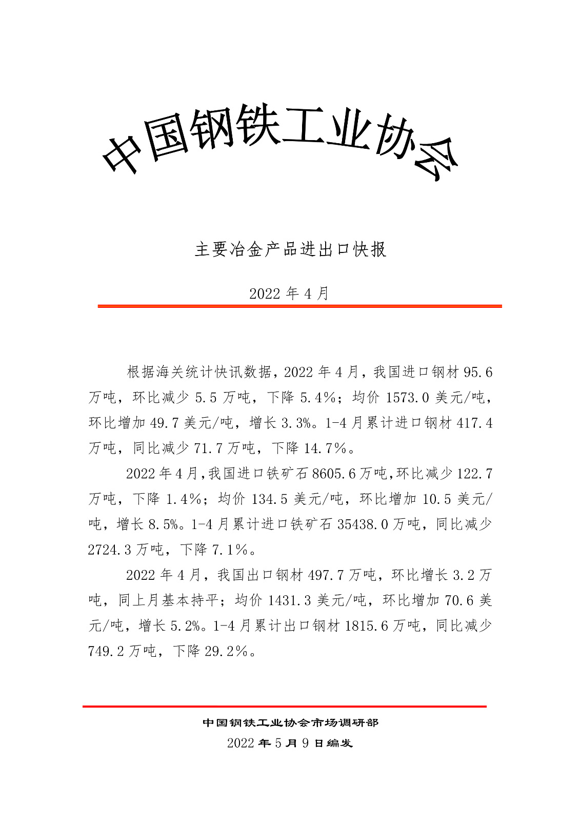 根据海关统计快讯数据,2022年4月,我国进口钢材95.6万吨,环比减少5.5万吨,下降5.4%。